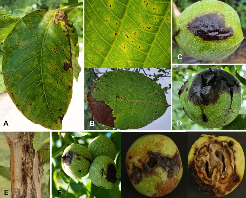 Alaphelyzetben az elsőként említett baktérium nem okoz gondot. Állandóan jelen van a diófákon, de szinte észrevehetetlen. Ám kontrollálatlan módon el tud szabadulni a folyamatos párás, nedves, vizes környezetben. Terjedését ráadásul a vízcseppek és szél segíti elő. A baktérium a lehullott leveleken, a fertőzött dión tartja fenn magát, valamint a fakéreg repedéseiben és rügypikkelyek között is, itt is telel át.